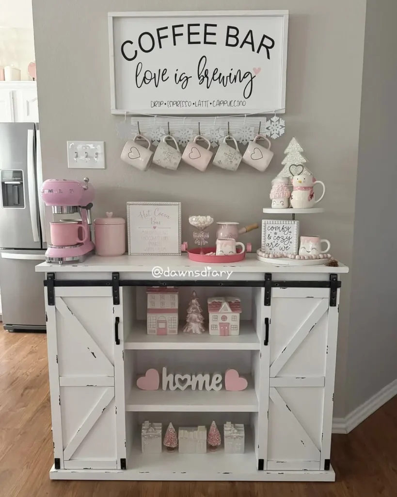 This setup blends pink heart decor with white snowflake accents for a seasonal crossover that actually works.