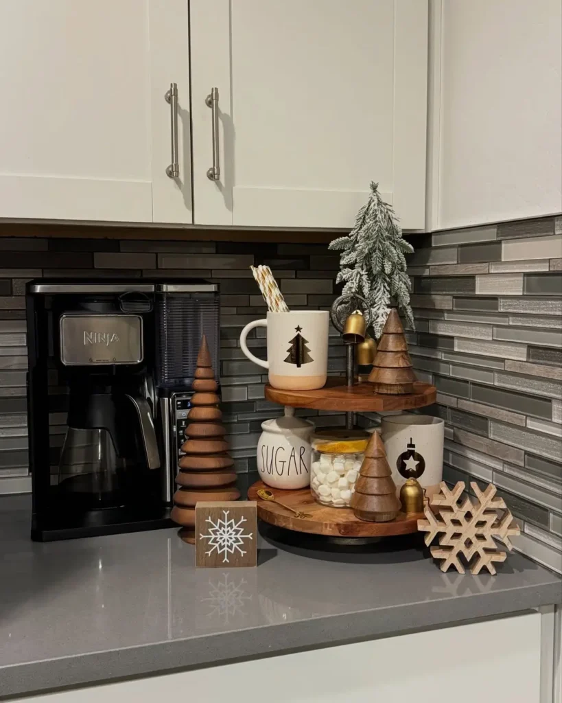 This neutral holiday coffee bar swaps bold colors for pine garlands, wooden trees, and soft ornament decor.