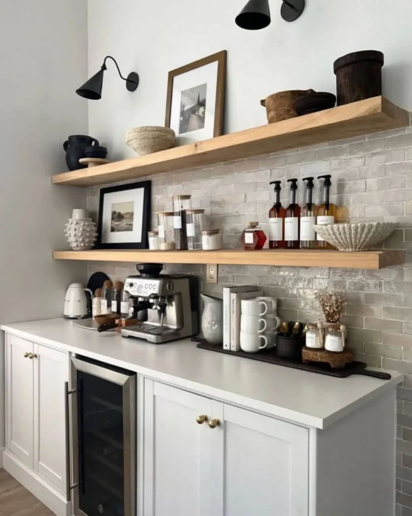 This recessed nook feels custom and elevated. A tiered tray with cups and syrups keeps it functional while still feeling luxe and cozy.