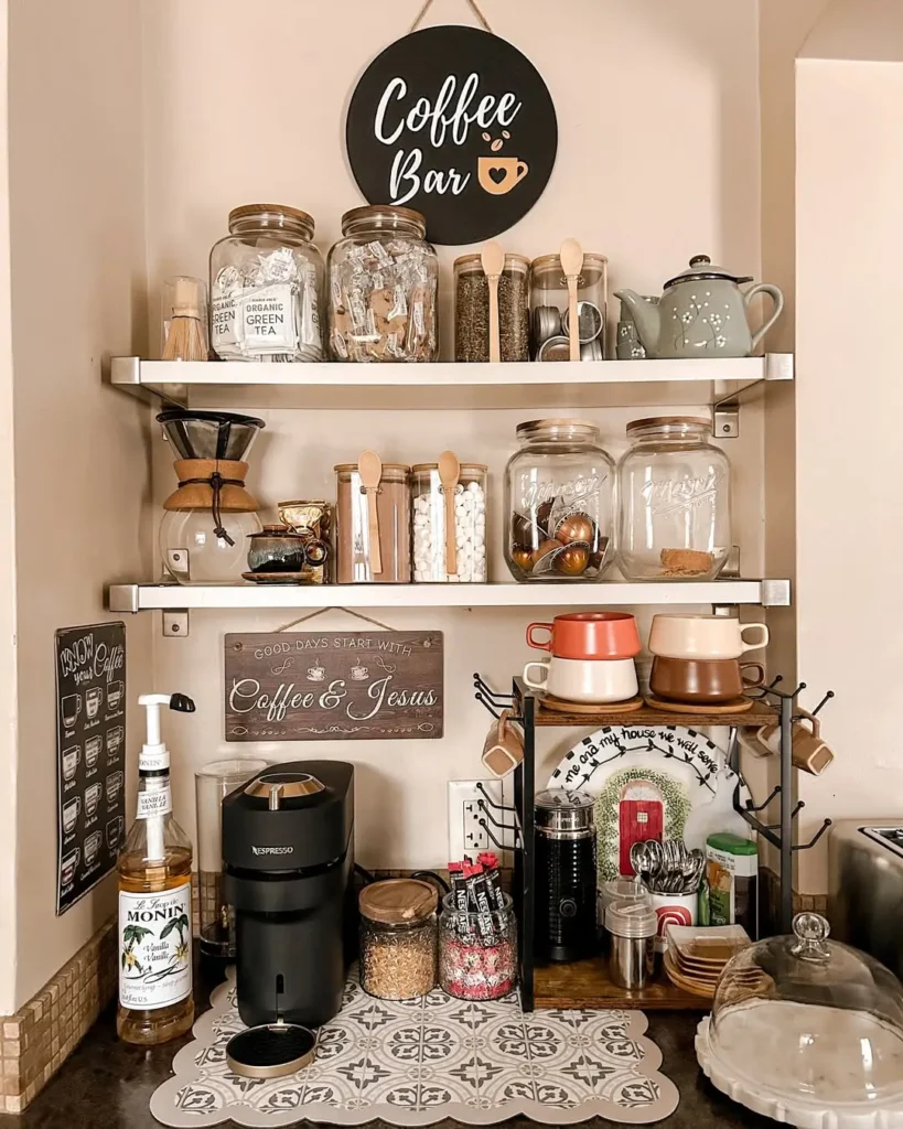 This cozy corner setup by decorfhir proves you do not need a huge space to make a statement. A wooden tiered tray holds daily essentials while a Ninja coffee maker anchors the look.