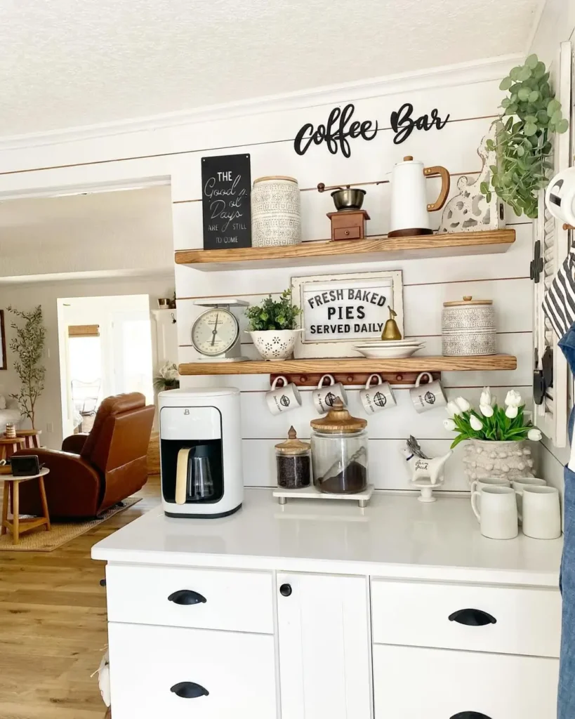 This farmhouse style coffee bar features shiplap walls, wooden signs, and a touch of greenery.