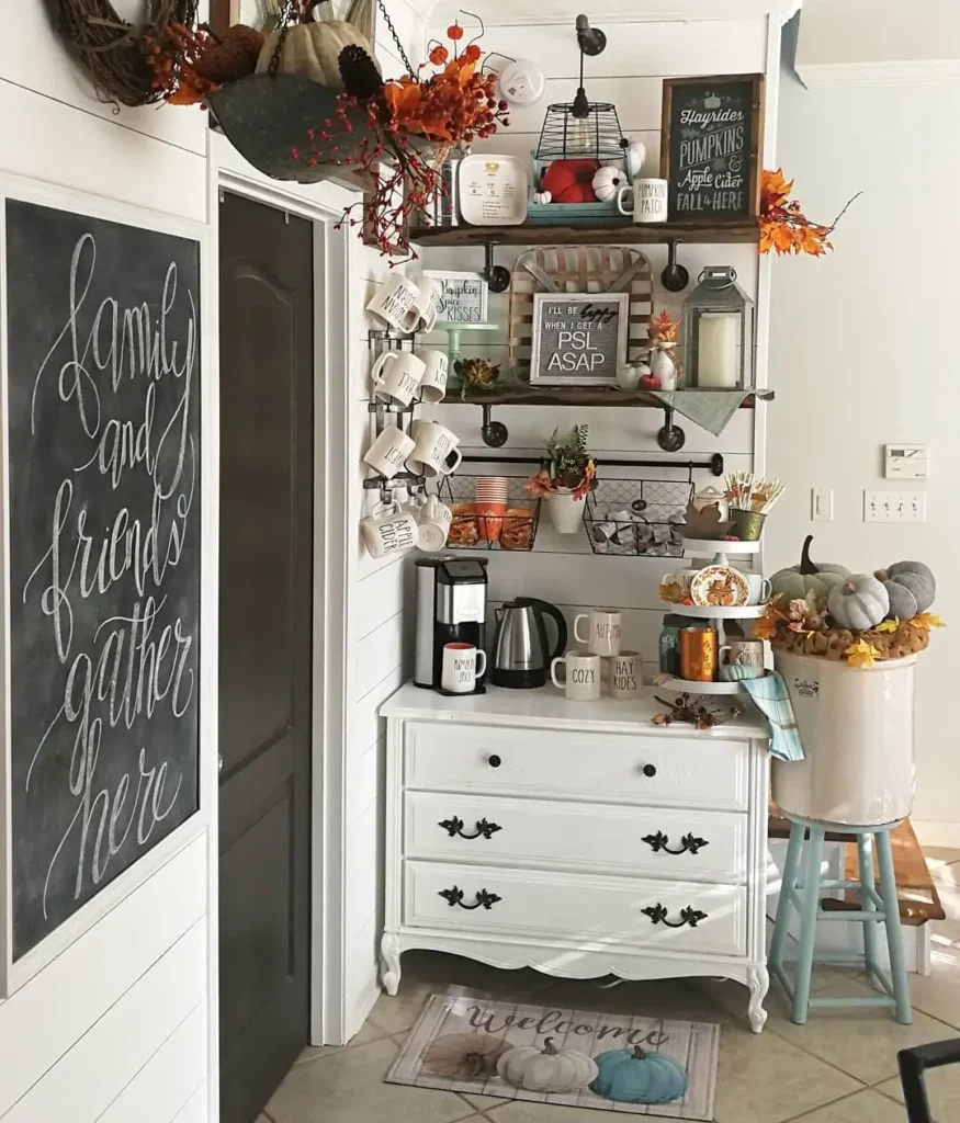This fall inspired coffee bar embraces pumpkin themed decor in the coziest way.