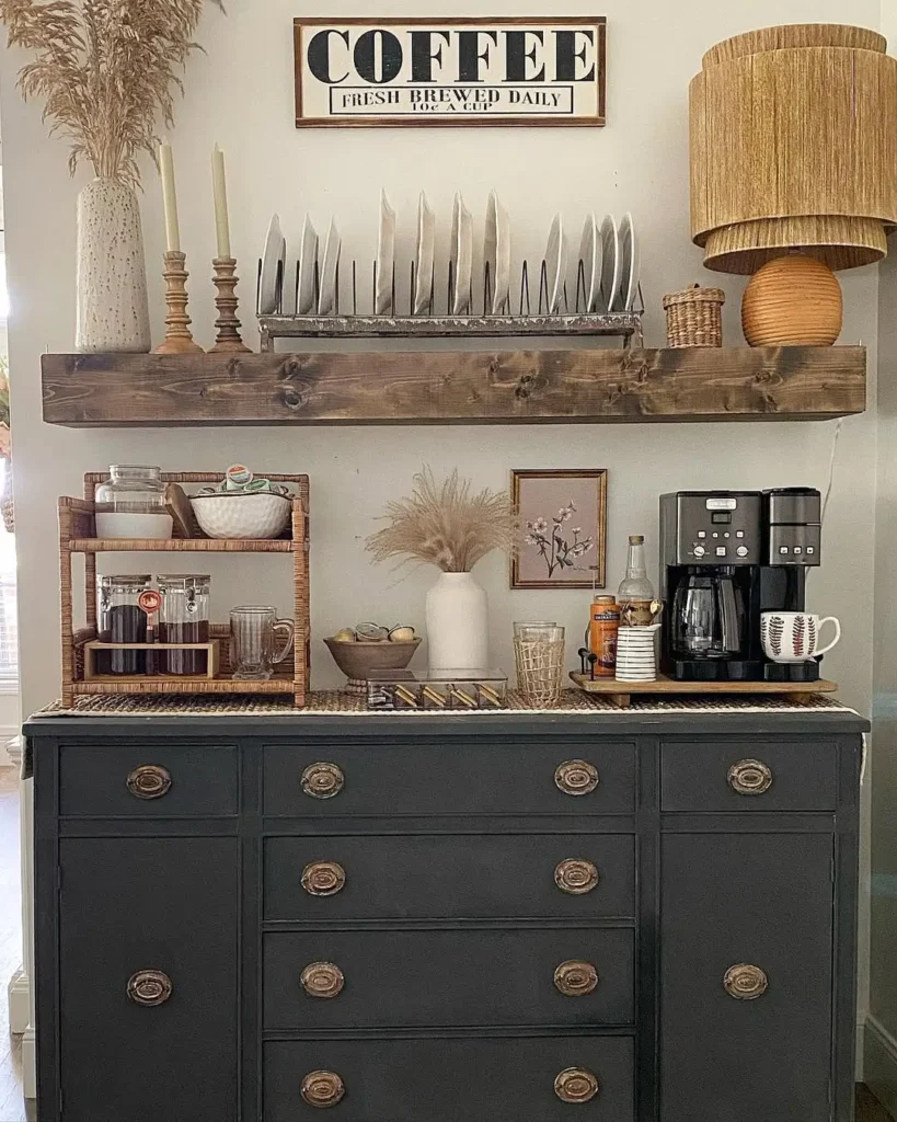 This bohemian coffee bar layers pampas grass, woven textures, and a rustic wooden coffee sign for an earthy, relaxed feel.
