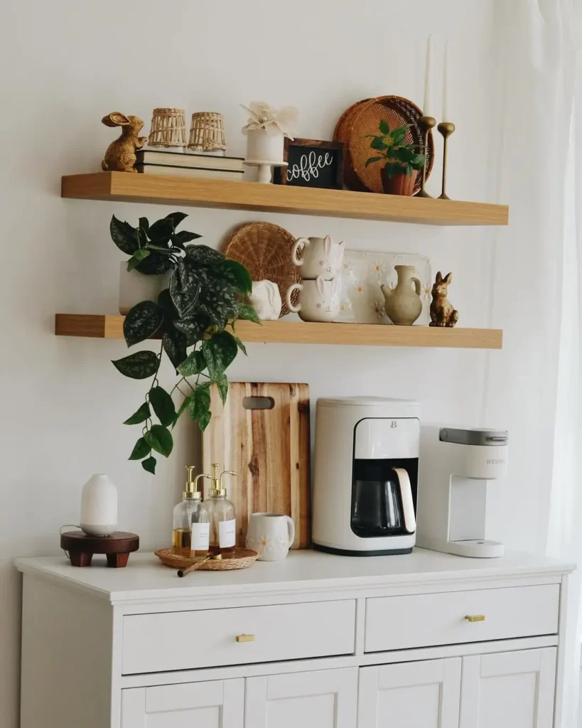 This all white coffee station feels airy and playful. With a Keurig, bean coffee maker, modern glass syrup dispensers, and floating shelves decorated with bunny accents .