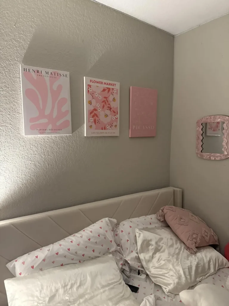 A gallery wall above the bed is such a fun way to show personality. Use framed prints that are colorful, playful, and full of life. Mixing art styles keeps it interesting while still feeling cohesive.