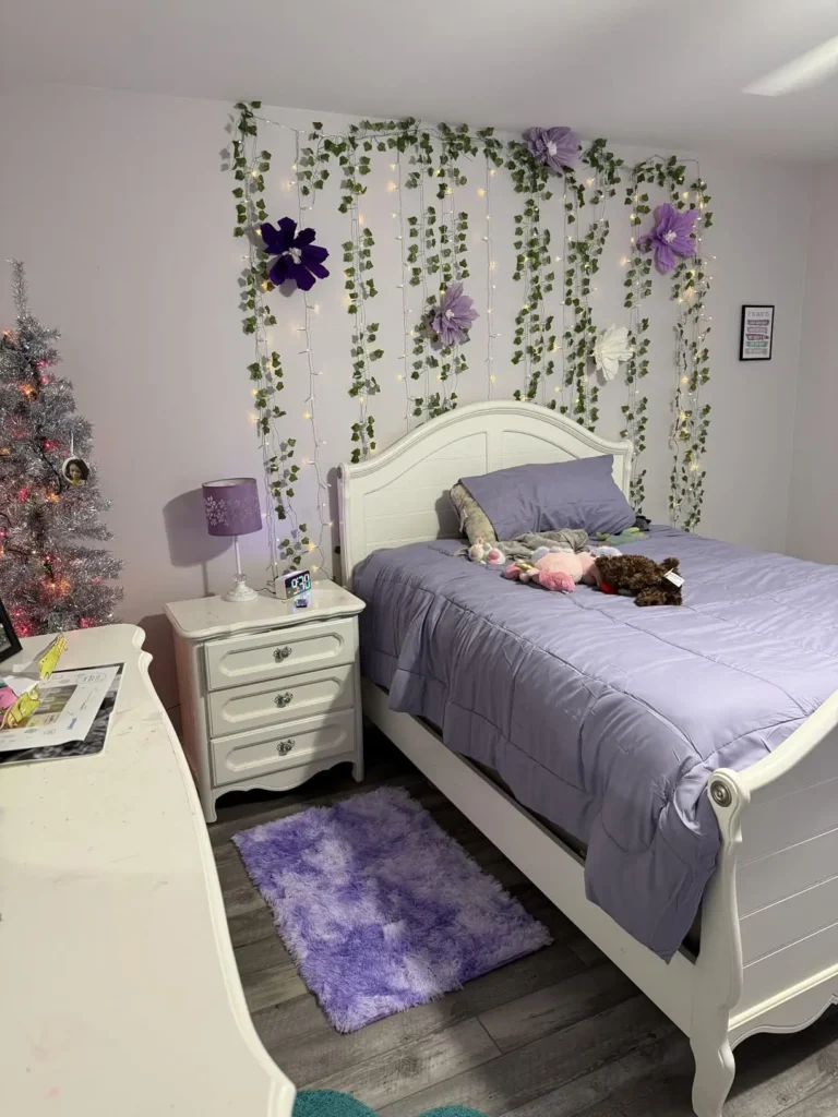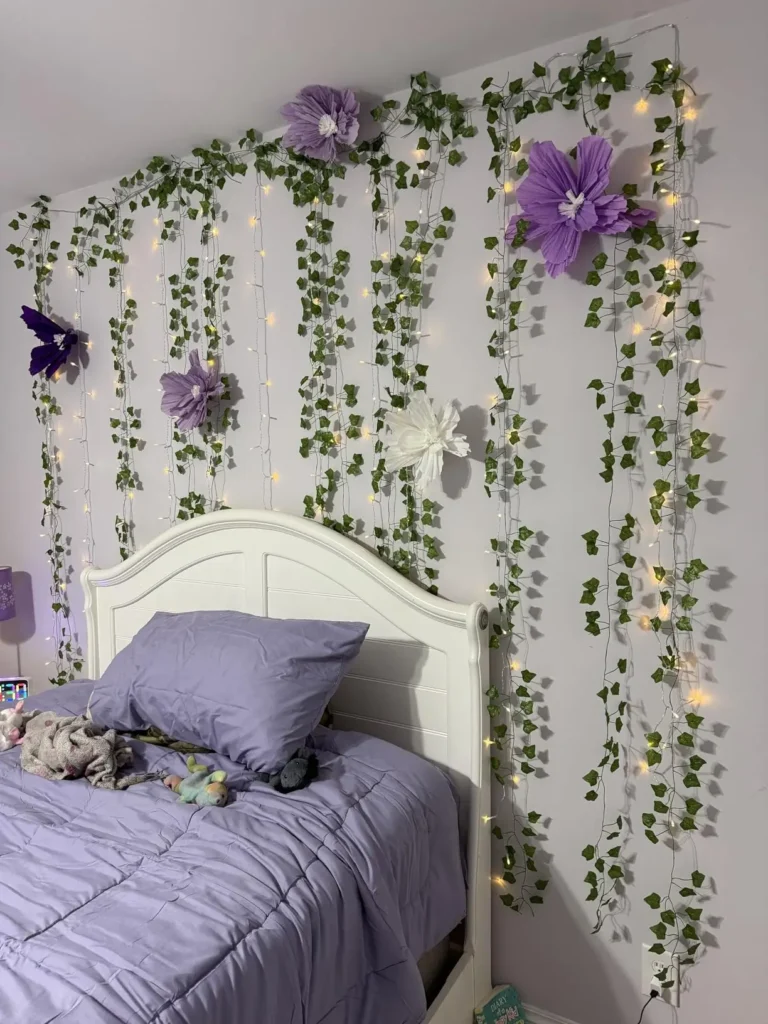 String lights woven through the vines create a magical glow, especially at night. Scattered purple flowers tie into the bedding and rug perfectly.
