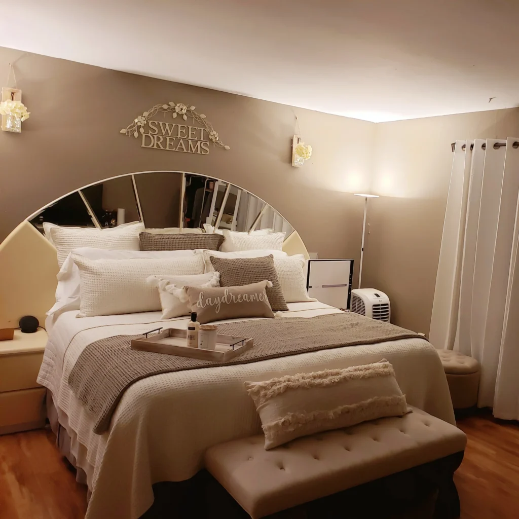 Soft lighting instantly makes the space feel warmer and more inviting, especially when you add it as a decor accent to the wall above the bed.