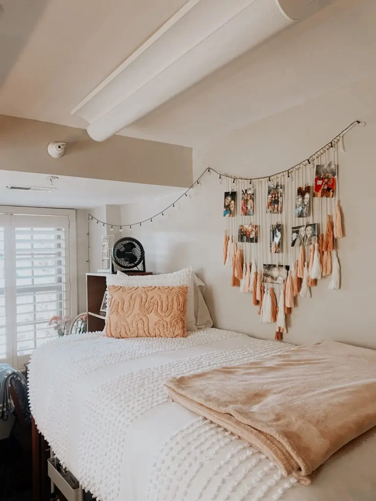 A photo collage above the bed is pure nostalgia. Polaroids clipped onto string lights instantly make the room feel personal and warm.