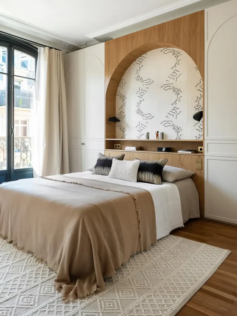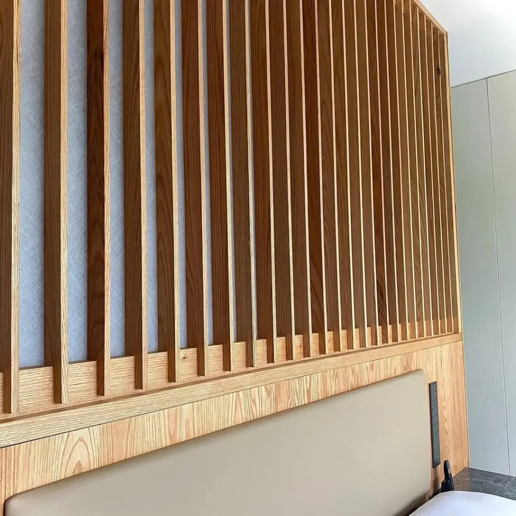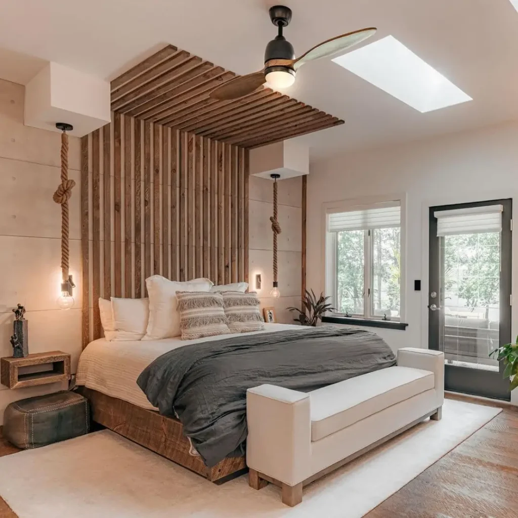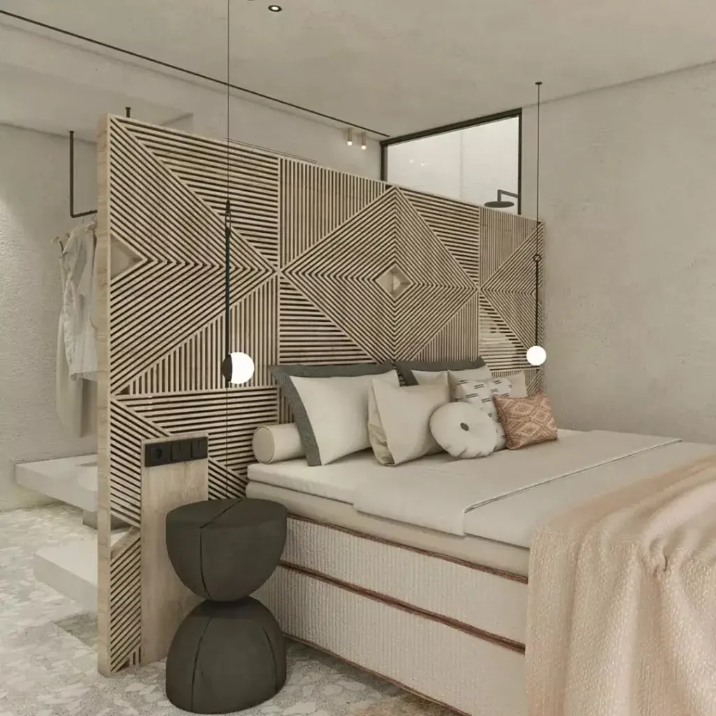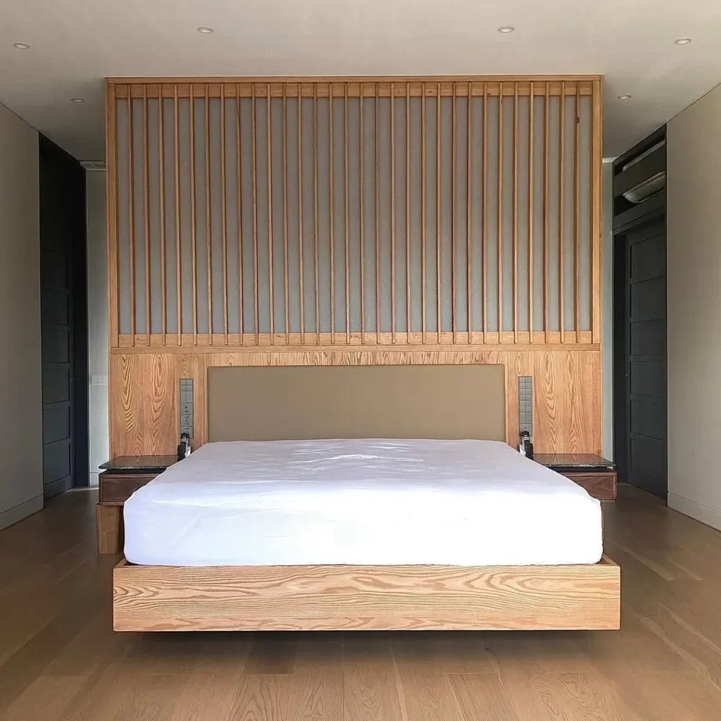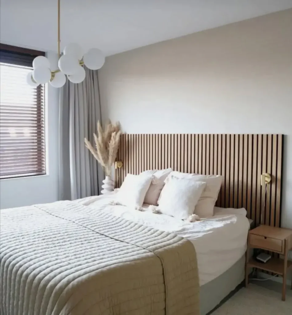 This wooden headboard feels intentional, architectural, and deeply calming.