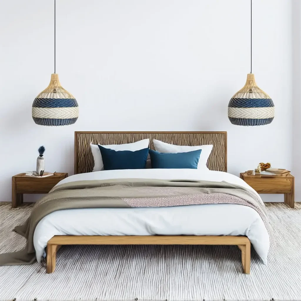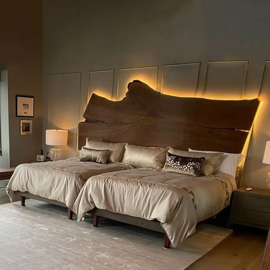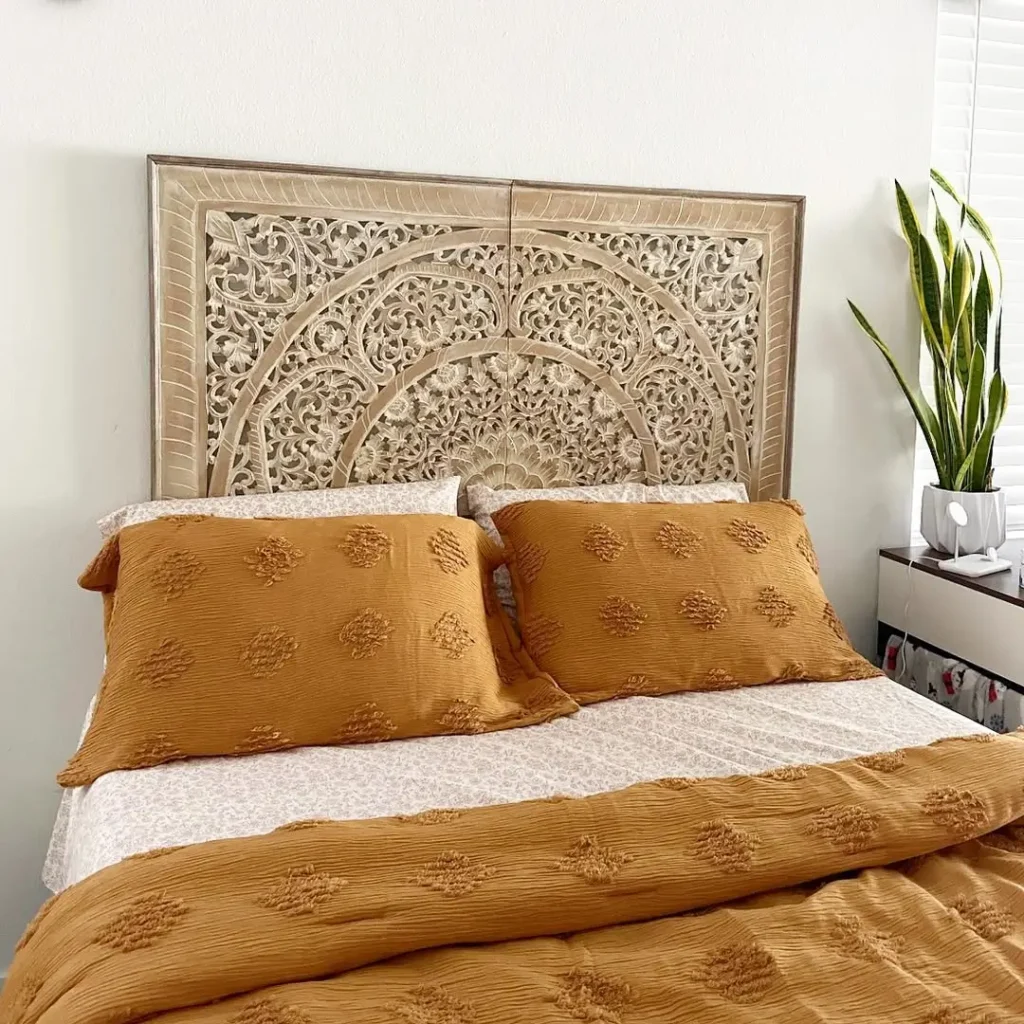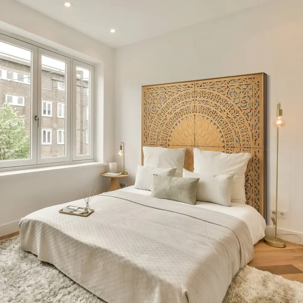 This wooden headboard feels calm, elegant, and timeless. It adds interest without demanding attention, making it perfect for serene and neutral bedrooms.