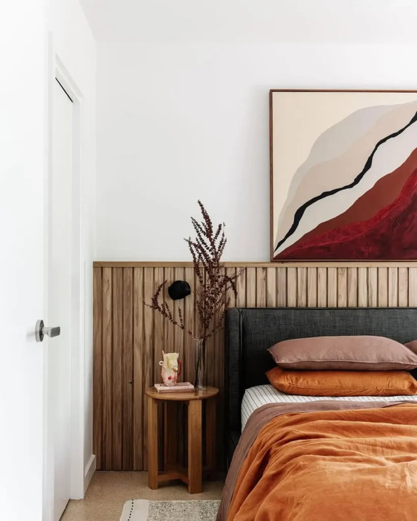 The rich wood paneling feels grounding and refined. It transforms the wooden headboard into a statement feature rather than just a backdrop.