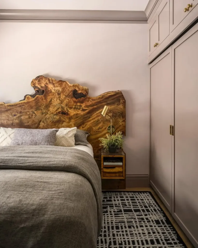 Shared by @brookeschuldt_seldensdesign, this live edge wooden headboard celebrates the natural beauty of wood.