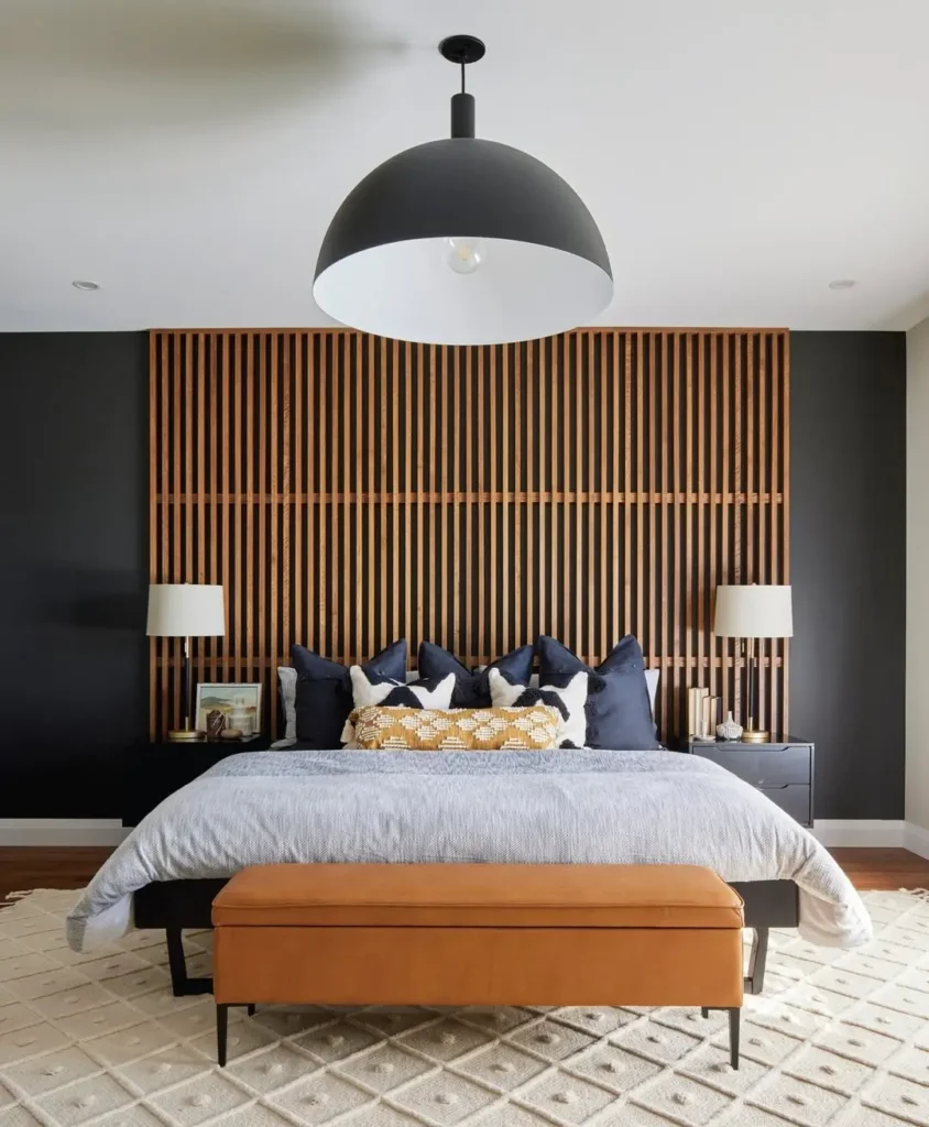 Shared by Our Homes Magazine, this slat wood headboard against a black accent wall is all about contrast.