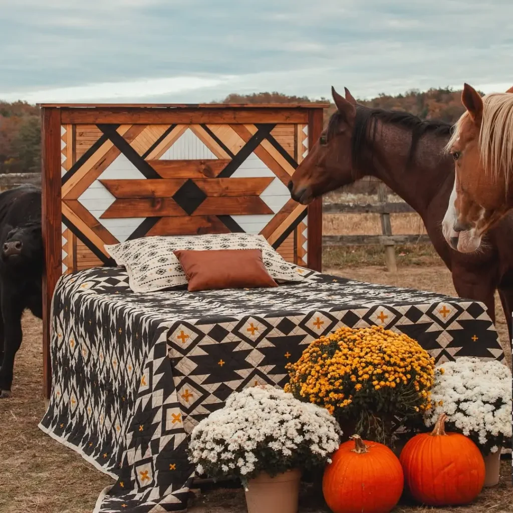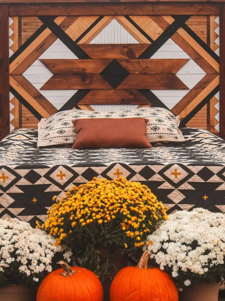 This custom painted wooden headboard by Jordan at @painted.mtn.mare adds playful personality to the room.